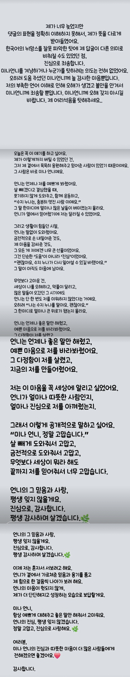 Suzy said "I'm just sorry to Mina for the misunderstanding and anxiety caused by my lack of understanding of the language. Please don't misunderstand Mina. Please blame me for my stupidity. My sister always looked at me pretty. I could be different because my sister believed me. When life was difficult, my sister helped me without saying anything. "It was a huge gift to reach out to me financially and to embrace my heart," he said.