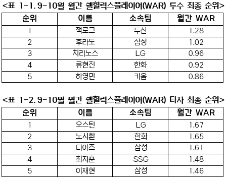 'Shellheelix Player' is selected based on WAR (contribution to victory over replacement players), and Doosan Zachlog topped the list with WAR 1.28 in the September-October pitching category.