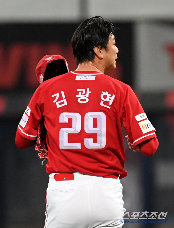 At the fourth semi-PO game between Samsung and SSG held at Lions Park in Daegu on Sunday, Kim Kwang-hyun, the starting pitcher of SSG, is catching his breath as the team is facing a crisis with two outs and full bases loaded in the bottom of the third inning. Daegu = Reporter Park Jae-man pjm@sportschosun.com /2025.10.14/
