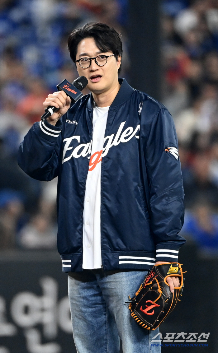 Lee Jang-won, a member of the band Peppertons, is throwing the first pitch in the fifth round of the PO match between Samsung and Hanwha at Hanwha Life Ball Park in Daejeon on the 24th. Daejeon = Reporter Huh Sang-wook's wook@sportschosun.com/2025.10.24/